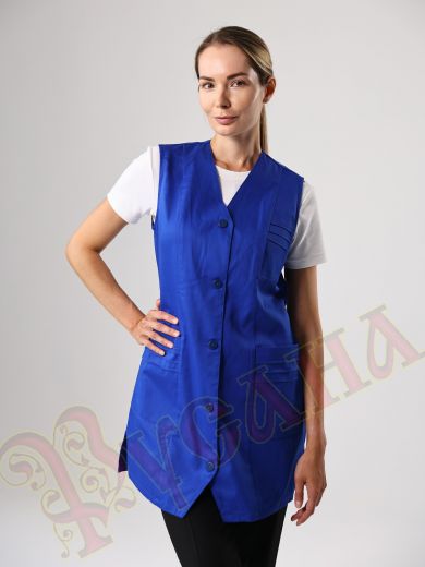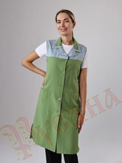Фартук "Брянск" полуприлегающего силуэта, с рельефами на полочке и спинке, выходящими из проймы. Карманы в швах рельефов. Вырез горловины лодочкой, с небольшим отложным воротничком.  Воротничок и бочок фартука контрастного цвета. Плечевой срез расширенный. Прилегание к фигуре регулируется полупоясами спереди и сзади. Линия низа прямая, длина средняя. Фартук отшивается в трех размерах  L (44-48),  XL (50-54),  XXL (56 и более).