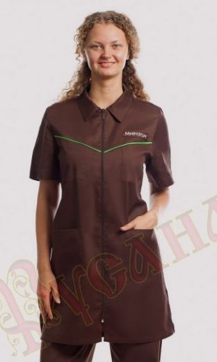 Халат продавца "Бежин луг" прямого силуэта с центральной застежкой на молнию. Воротник отложной, рукава короткие, широкие. Линия низа прямая, по бокам разрезы. По переду фигурная кокетка с контрастным кантом и нагрудными карманами, повторяющими фигурную линию. Спинка с прямой кокеткой. Линия талии подчеркивается полупоясами в боковых швах, которые завязываются сзади. Дополнен халат двумя накладными карманами по бокам.