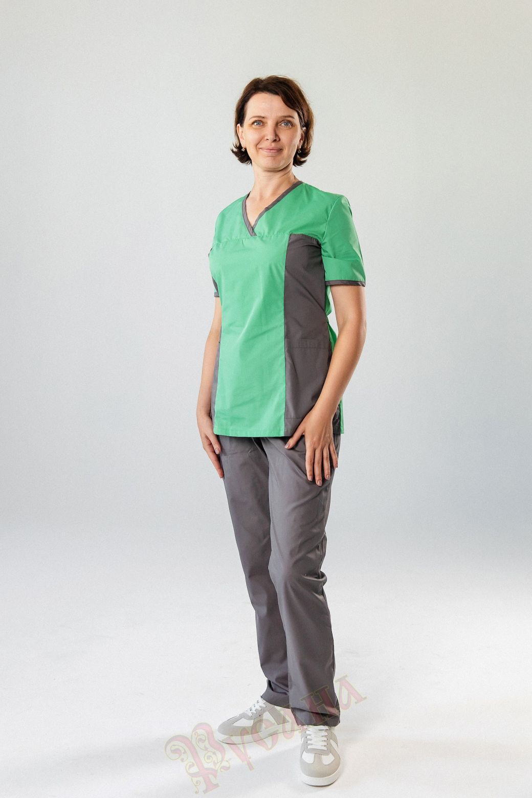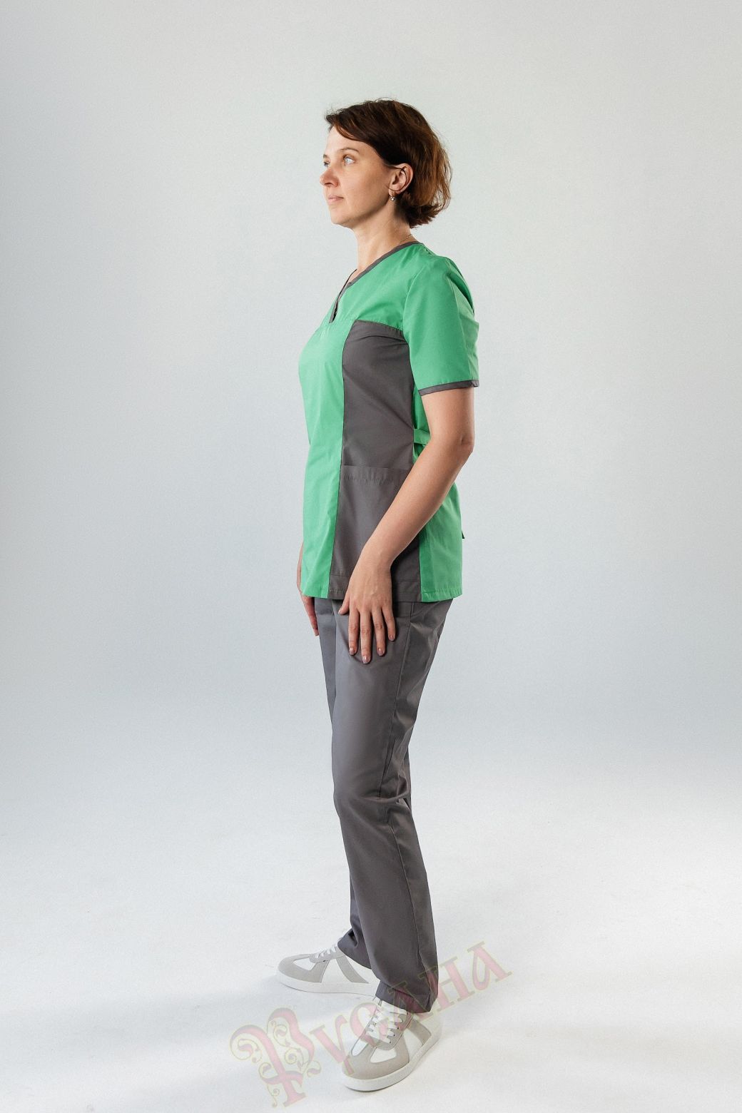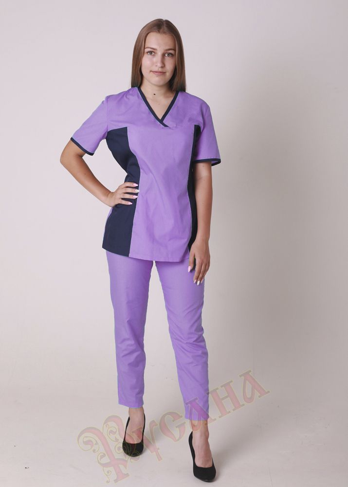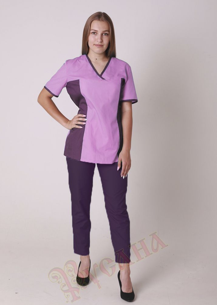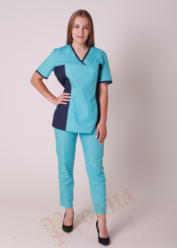 Костюм "Светлячок" состоит из куртки и брюк. Куртка полуприлегающего силуэта. Боковые части из более темной ткани придают образу стройность. Окантовка отделочной тканью по горловине и рукаву. Карманы у куртки в швах. Полупояса из боковых швов регулируют прилегание в области талии. Брюки на резинке и заужены к низу. Модель не стесняет свободу движения, подчеркивает достоинства фигуры и скрывает недостатки. Подойдет для бьюти сферы и персонала СПА салонов.