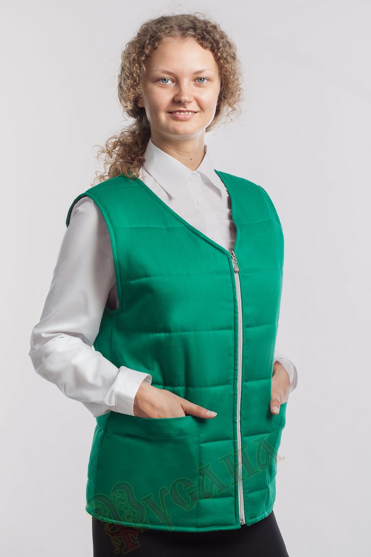 Жилет утепленный "Луг" рабочий стеганый - удобный и практичный жилет подойдет работникам торговли, рабочему персоналу, работникам администрации в холодных помещениях. Жилет прямого силуэта с накладными карманами. Застежка центральная на молнию. V-образный вырез горловины. Жилет утепленный на подкладке, ткань верха - смесовая средней плотности 35% хлопка, 65% ПЭ. Либо на выбор курточная ткань - 100% полиэстер, утеплитель - холлофайбер 200 г/кв.м, подкладка - 100% полиэстер. Горизонтальная стежка с расстоянием между строк 9 см. Всегда можно дополнить вышивкой вашего логотипа на груди или спине. Жилет может быть удлиненным или составлен из тканей разных цветов. Цену на модификации модели уточняйте.