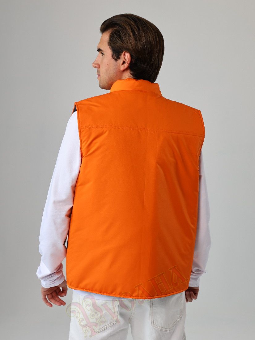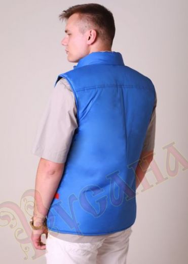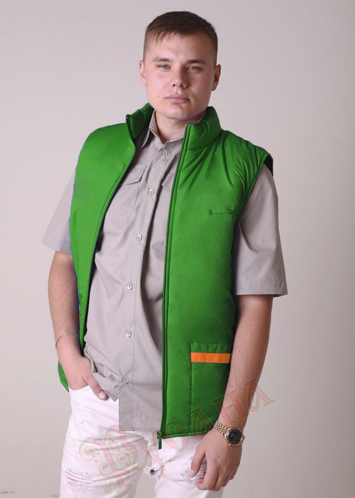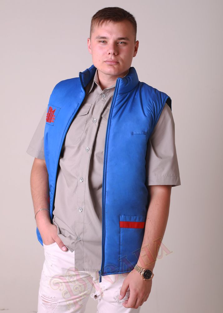 Жилет утепленный "СМ" рабочий - популярная модель мужского жилета. Прямой силуэт, длина по середину бедра, застежка молния, карманы накладные, воротник стойка. Жилет часто используют в спецодежде продавцов, администраторов, работников складских помещений, сервисных служб. Отделка на кармане делается по желанию заказчика. На образце отделка сделана с целью поддержать вышивку логотипа заказчика.