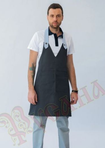 Фартук "Грей" - фартук-передник с V-образным вырезом. Бретель через шею на пуговицах спереди. Сзади завязки, можно завязать на спине, или обернуть и завязать спереди. Большой удобный карман. Может быть выполнен в 2-х цветах или в одном цвете.