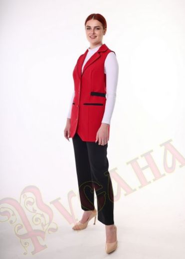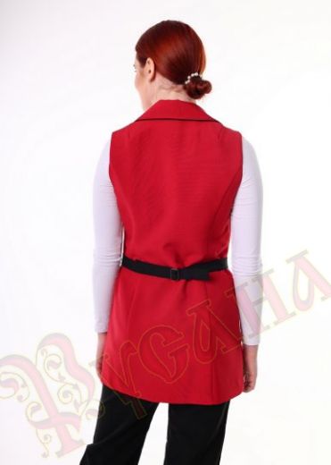 Жилет "Яшма" женский - новая яркая модель классического жилета. Приталенный силуэт, рельефы по полочке и спинке. Воротник пиджачного типа, закругленная форма воротника и лацкана подчеркнуты кантом контрастного цвета. Карманы прорезные в рамку. Полупояса выходят из передних рельефов и фиксируются сзади на пряжку. Это выделяет талию и позволяет хорошо регулировать ширину изделия, что очень важно для униформы. Линия низа с фигурным вырезом к борту. В целом, модель сложная и интересная. Подойдет для формы администраторов, продавцов косметики или ювелирных изделий. Подкладка из поливискозы жаккардового переплетения.