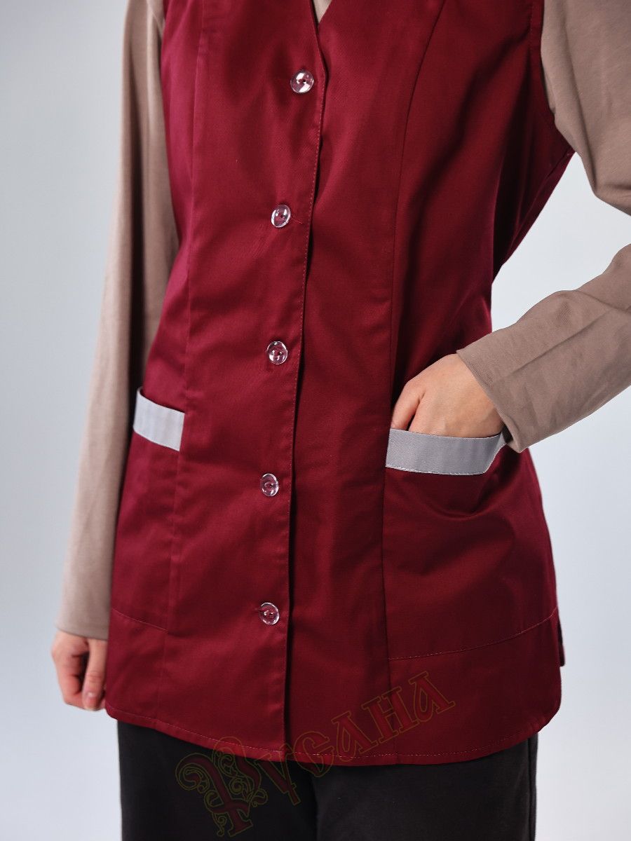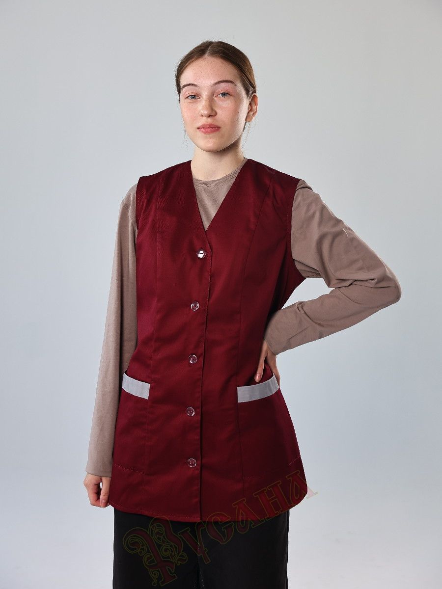 Жилет рабочий "Калуга+" женский без подкладки из плотной смесовой ткани. В жилете рельефы по переду, спинка прямая из боковых швов полупояса завязываются сзади. Данная модель для конкретной торговой сети. Изготовим корпоративную одежду в ваших корпоративных цветах и с вашим логотипом. Подберем цвет. Возможна замена деталей (карманы, форма выреза горловины). Модель выполнена из качественной ткани. Свойства ткани позволяют сохранять опрятный вид на долгий срок. Водоотталкивающая пропитка защищает одежду от загрязнений или промоканий.
