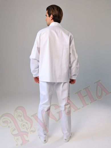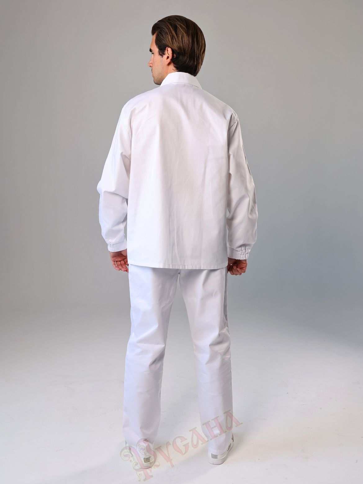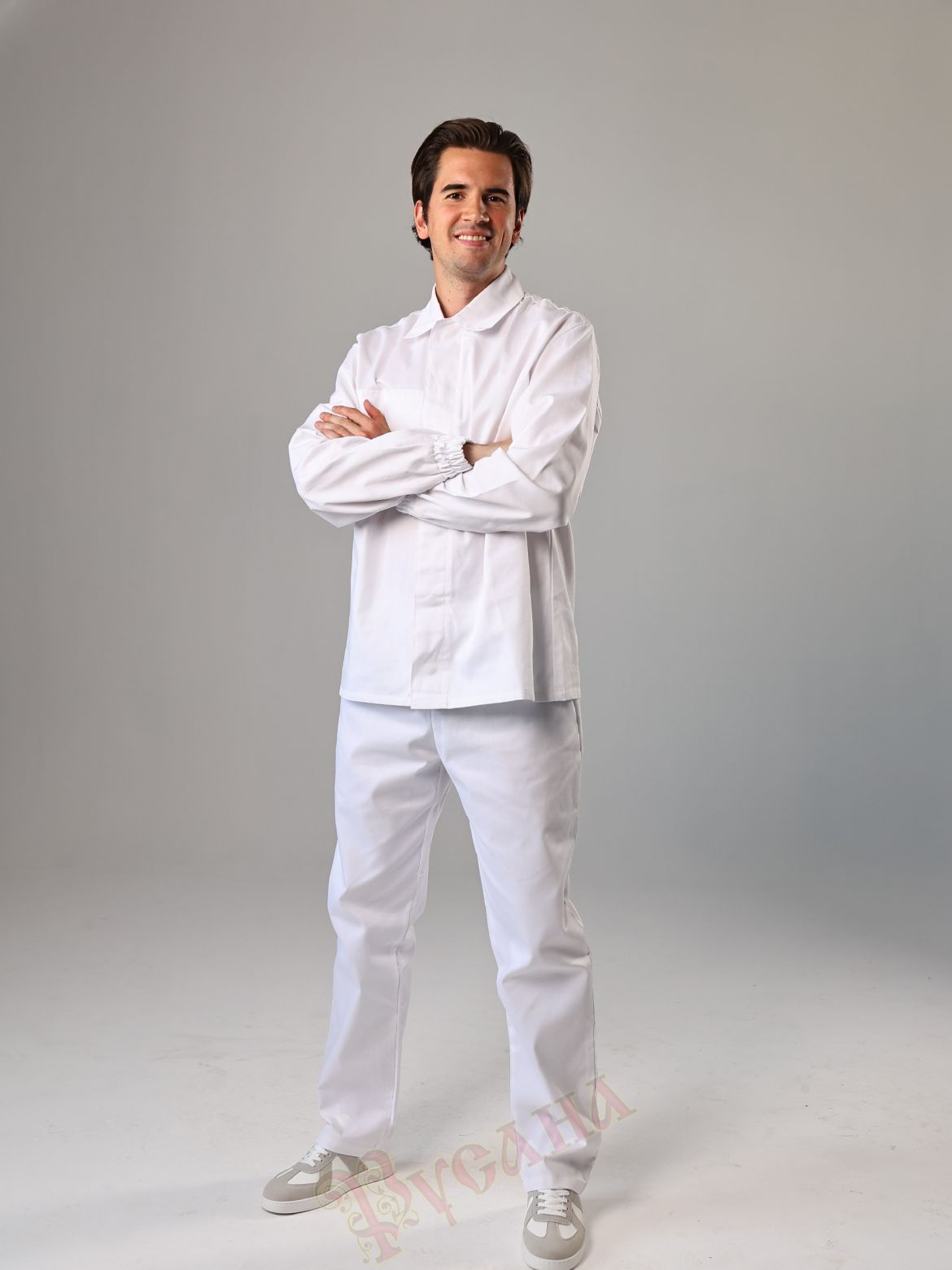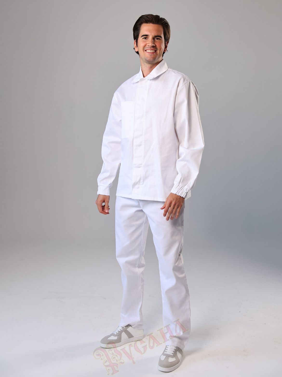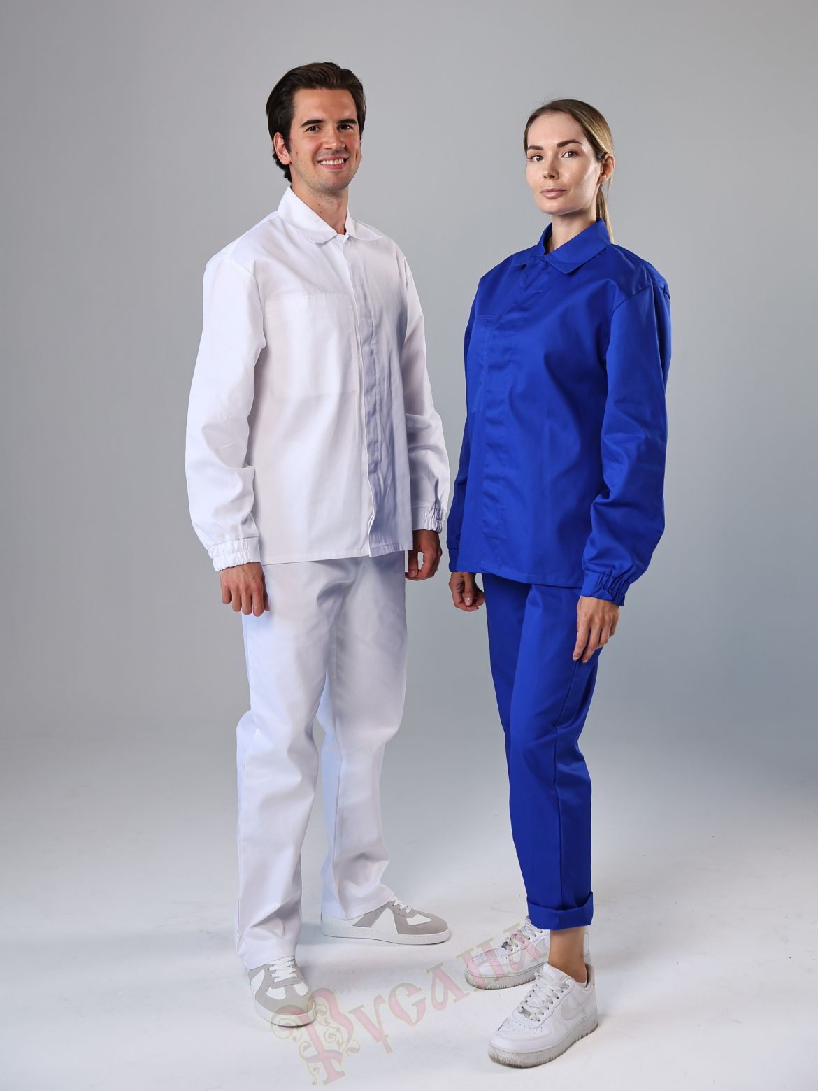 Костюм для работы на производстве стандарта ХАСПП состоит из куртки и брюк. Куртка с супатной застежкой на кнопки (нержавейка). Брюки на резинке. Куртка (или укороченный халат по желанию заказчика) прямого силуэта, сзади хлястик. Внутренний карман на молнии. Рукава халата с манжетой, манжета частично на резинке. Воротник отложной. Представлены костюмы цветные, но основные заказы по ХАСПП - белые. Возможно изготовление спецодежды одной модели, но разных цветов для разных специальностей. Модель не стесняет свободу движения. Для пошива спецодежды используется качественная ткань с водоотталкивающей пропиткой. Пропитка защищает одежду от загрязнений и промоканий. Костюм прекрасно защищает от общепроизводственных загрязнений и механических воздействий.